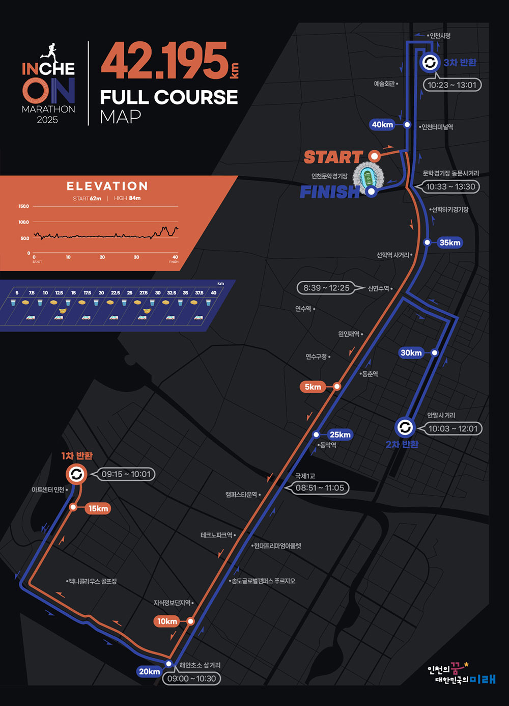 - 풀코스(42.195km): 문학경기장 → 송도국제도시 → 연수IC → 복귀