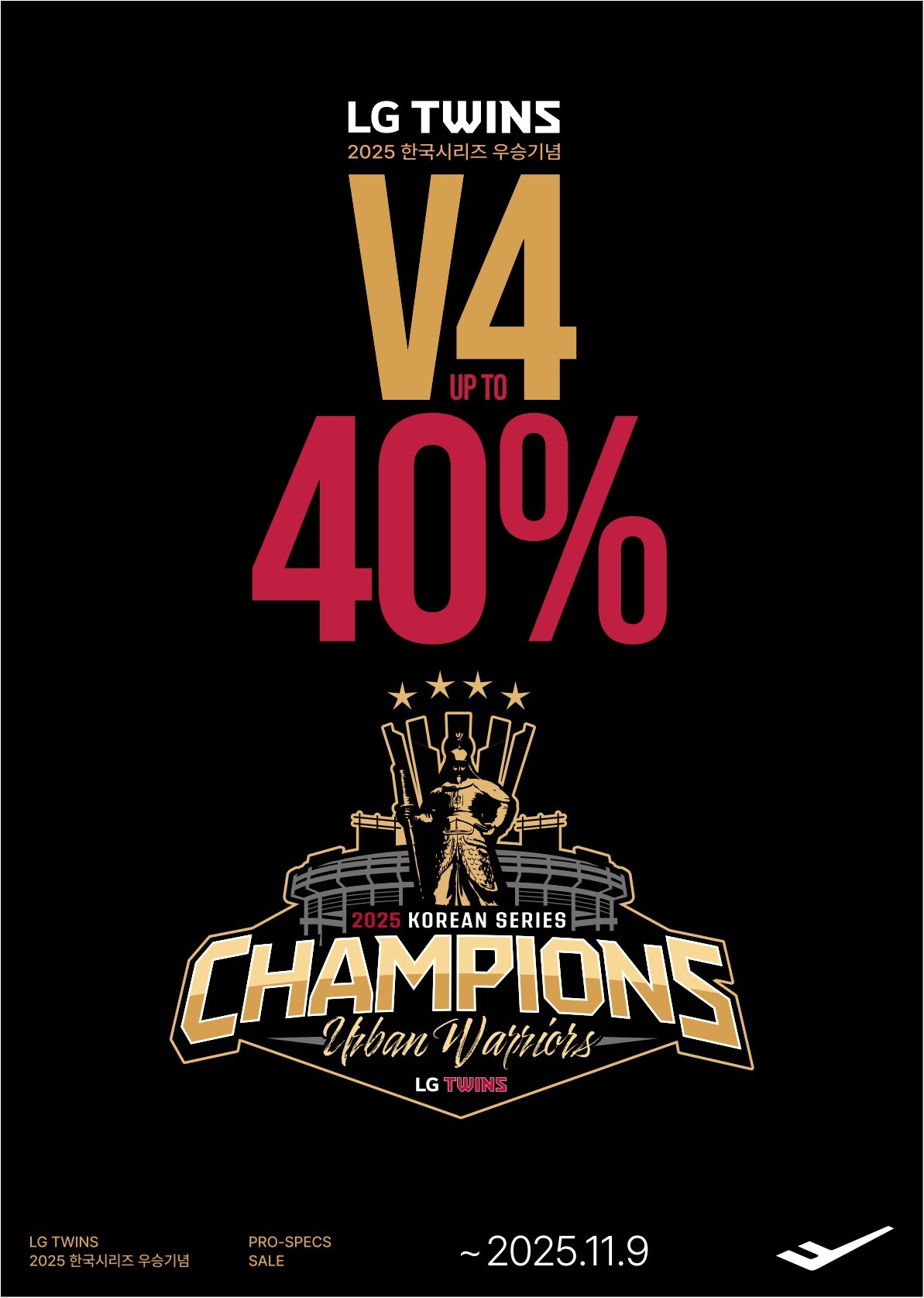 LG 트윈스의 통합 우승을 기념해 **프로스펙스(PRO-SPECS)**가 팬들을 위한 대규모 할인 이벤트를 엽니다.