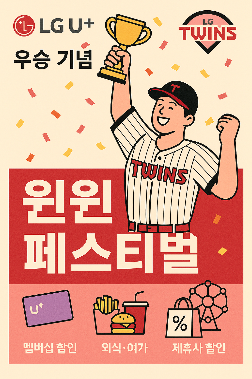 LG트윈스의 통합 우승을 기념해 LG유플러스가 멤버십 고객 대상 대규모 할인 이벤트를 준비했습니다. 이름하여 ‘윈윈 페스티벌’!